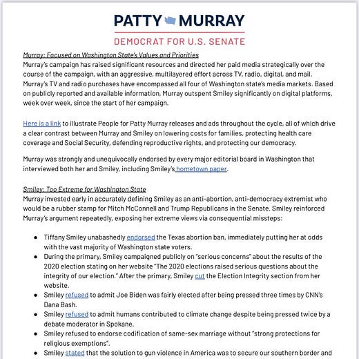La senatrice Democratica dello Stato di Washington, Patty Murray, ha diffuso un comunicato nel quale scrive che con molta probabilità i network e i giornali non le assegneranno la vittoria già stanotte, come invece era avvenuto nel 2016, e che potrebbero trascorrere giorni prima di conoscere la vincitrice. La sua avversaria è la Repubblicana Tiffany Smiley.