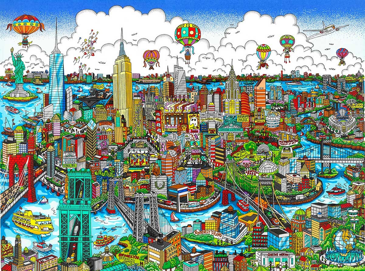 Charles Fazzino fonde in questo modo elementi della cultura pop con intricati lavori artigianali, dedicandosi a una vasta gamma di soggetti. Questi variano da paesaggi urbani vivaci – come le vedute di grandi città tra cui Parigi, Tokyo o New York – a rappresentazioni nostalgiche di icone hollywoodiane o leggende dello sport.
