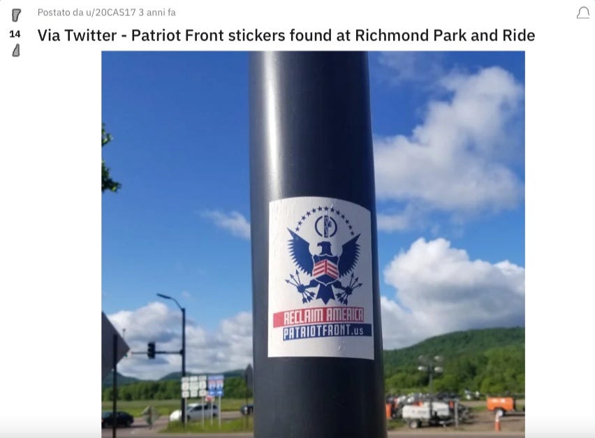 Grazie alla sua propaganda e al martellante street marketing, il Patriot Front si è fatto notare anche nel Green Mountain State con cortei spontanei, manifesti, volantini e adesivi, spesso incollati sopra a quelli di Bernie Sanders.