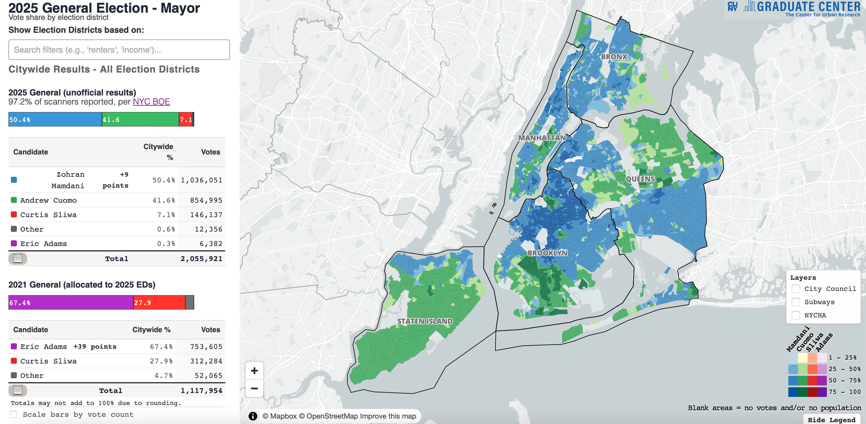 In generale, Cuomo ha prevalso tra gli elettori bianchi, battendo il 37 per cento di Mamdani con il suo 45 per cento, mentre Mamdani ha ottenuto il 59 per cento degli elettori asiatici, il 45 per cento degli ispanici e il 48 per cento degli afroamericani. Tra questi ultimi, Mamdani ha registrato un forte incremento rispetto ai risultati delle primarie: nei quartieri a maggioranza afroamericana è passato dal 39 al 64% per centodei voti alle elezioni generali. Queste aree, situate nel sud-est del Queens e nell’est di Brooklyn, sono state decisive per la vittoria.