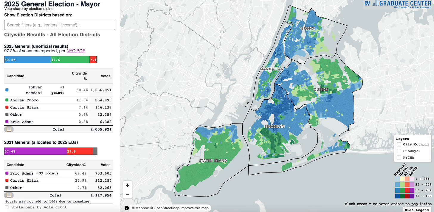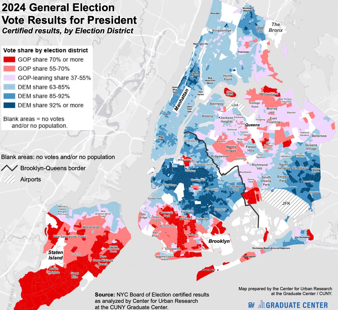 Detto ciò, come osserva il giornalista Dan Krauth di ABC Seven, la mappa delle comunali del 2025 ricalca quella delle presidenziali del 2024: la maggior parte degli elettori di Trump ha preferito Cuomo, mentre quelli di Harris hanno sostenuto Mamdani. Gli sforzi di quest’ultimo, alla fine, non sono bastati a riconquistare per intero l’elettorato trumpiano, anche se è riuscito a farlo con una parte significativa