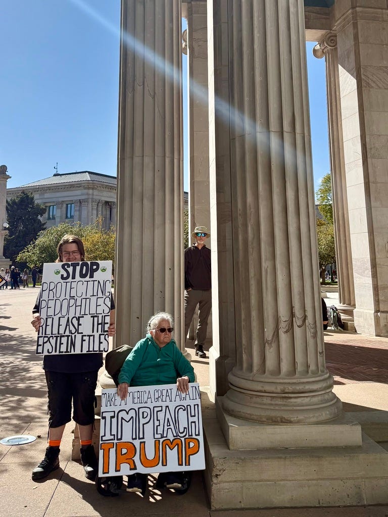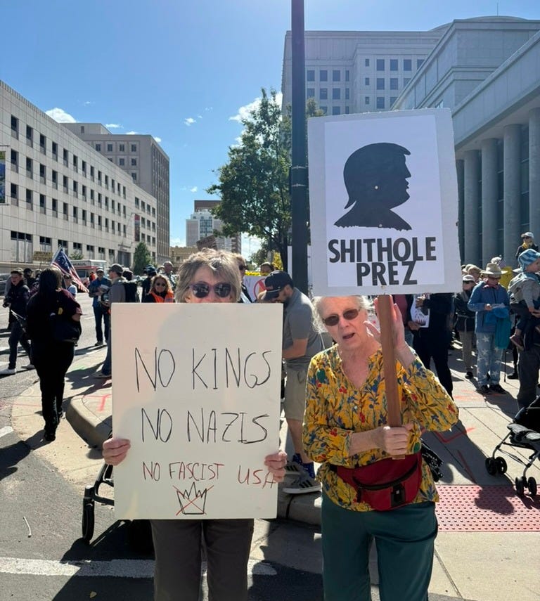 “Sono qui perché sono contraria a tutto ciò che sta accadendo. Sono persone crudeli”, ha detto Patti, a sinistra nella foto, sul cui cartellone si legge “No ai re. No ai nazisti. No agli USA fascisti”.
