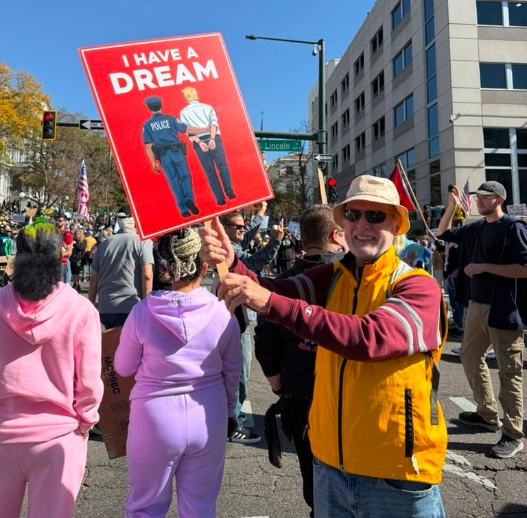 “Sto cercando di salvare l’America”, dice Marty, sventolando un cartellone il cui proverbiale sogno di Martin Luther King raffigura la polizia nell’atto di arrestare Donald Trump.